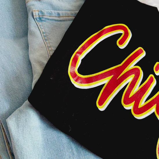 Cheer on your team in style with our Chiefs script tee! Featuring bold red and gold lettering with a sleek cursive design, this shirt is perfect for game days, tailgates, or showing team spirit any day of the week.
