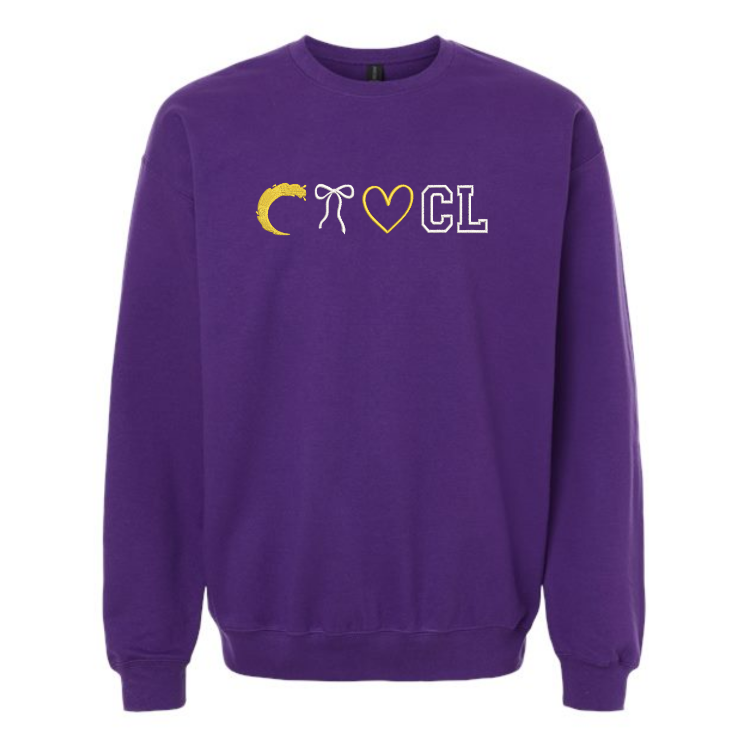 Embroidered purple crewneck Gildan Softstyle sweatshirt. Available in youth S-L and adult unisex XS-3XL.