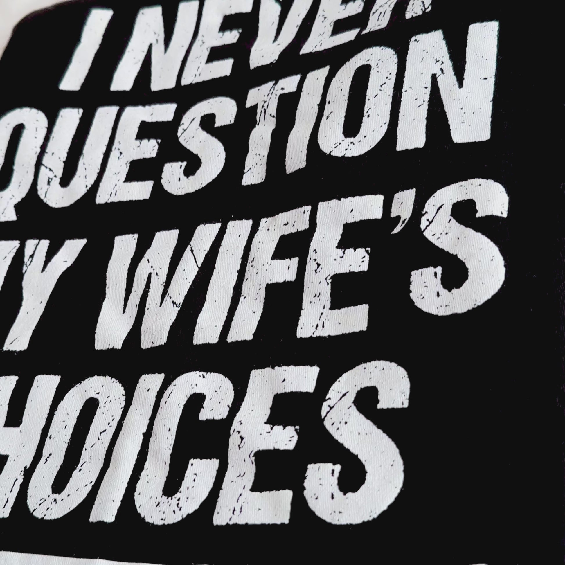 Show off your sense of humor (and love for your wife) with this hilarious I Never Question My Wife’s Choices Because I’m One of Them tee! Bold white lettering on a classic black shirt makes this the perfect statement piece for husbands who know their place — proudly chosen.