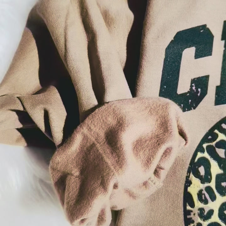 Cheer on your team in style with this trendy Kansas City Chiefs sweatshirt! Featuring bold “Chiefs Football” lettering and a unique leopard print football helmet design, this crewneck is perfect for game day, tailgates, or cozy everyday wear.